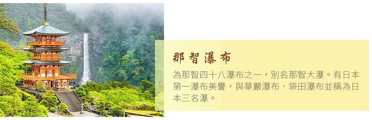 【那智瀑布】那智瀑布位於和歌山縣那智勝浦町,落差達133公尺、寬13公尺,是日本最高的單一瀑布,被譽為「日本第一大瀑布」,同時與華嚴瀑布、袋田瀑布並列「日本三大名瀑」。瀑布水流自青岸渡寺與熊野那智大社背後的原始森林奔騰而下,自古即被視為神聖之地,供奉於熊野那智大社飛瀧神社中,象徵自然崇拜的信仰核心。清澈水流傾瀉而下,形成震撼的水霧與轟鳴聲,遊客可近距離感受氣勢磅礴的景象。那智瀑布不僅是壯麗的自然奇觀,也是熊野古道信仰文化的重要象徵。