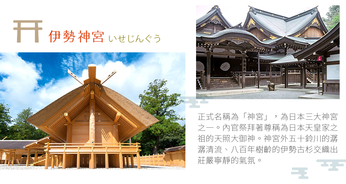 【伊勢神宮】伊勢神宮的正式名稱為「神宮」,位於日本三重縣伊勢市,由供奉天照大御神的皇大神宮(內宮)以及供奉豊受大御神的豊受大神宮(外宮)為主的125座神社所構成,其面積幾乎相當於法國巴黎市中心,在此一年內舉行約1,500場祭典,祈求皇室繁榮、國民平安及五穀豐收。