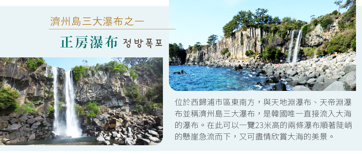 【正房瀑布】位於西歸浦市區東南方約1.5公里處的正房瀑布,與天地淵瀑布、天帝淵瀑布並稱濟州島內三大瀑布。作為瀑布水直接落入大海的東洋唯一海岸瀑布,高23公尺、寬8公尺、深5公尺。