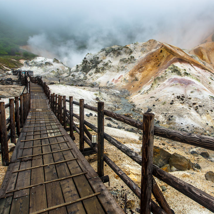 北海道西部登別一處舊火山爆裂口,直徑約450公尺,常年冒著白煙,週遭是寸草不生的猙獰地形,因此被稱為「地獄谷」。是登別最有名的溫泉之源,據說登別地區四分之三湯量都來自於此。內設有攬勝的木棧道,可見到最真實的火山地貌。