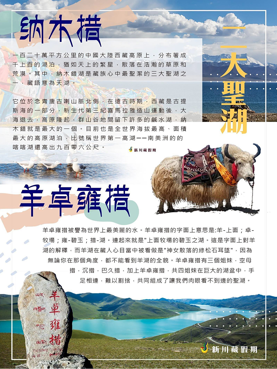 羊卓雍措藏語是『碧玉草原之湖』,羊湖與藏北的納木措、阿里的瑪旁雍措並列為西藏三大聖湖,位於西藏南部浪卡子縣境內,湖面海拔4441公尺,面積638平方公里,湖岸長達250公里,最深處有59公尺。 而世界上海拔最高的水力發電站-羊湖電站即坐落於此。是喜馬拉雅山北坡湖盆帶中最大的淡水湖。羊卓雍措被譽為世界上最美麗的水。羊卓雍措,意為“上面牧場的碧玉之湖”。這是字面上對羊湖的解釋,而羊湖在藏人心目當中被看做是“神女散落的綠松石耳墜”,因為無論你在那個角度,都不能看到羊卓的全貌,她有三個姐妹,空母措,沈措,巴久措,以即古羊卓雍措四姐妹在巨大的湖盆中,手足相連,難以割舍,共同組成了讓我們肉眼看不到邊的聖湖。她的身軀蜿蜒在群山中達一百三十多公里,只有在地圖或是高空你才能驚喜的發現她猶如耳墜,鑲嵌在山的耳輪之上。不同時刻陽光的炤射,她會顯現出層次極其豐富的藍色,好似夢幻一般。