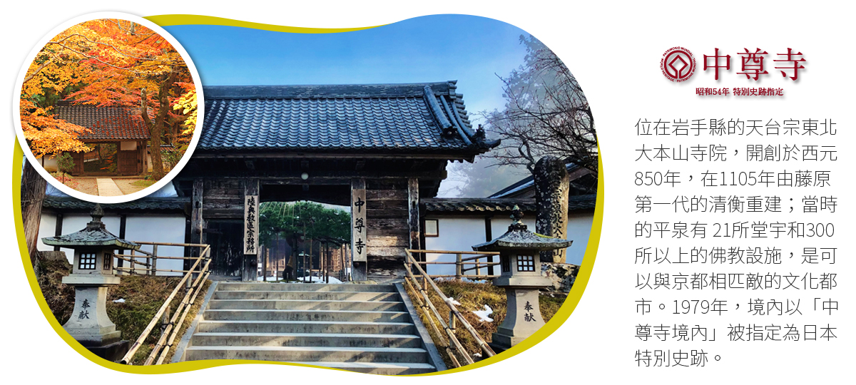 【中尊寺】由比叡山延歷寺慈覺大師開創於850年,是天台宗的東北總寺院,在全盛時期有40多座寺塔。而今僅存18座建物中又以內外堂貼有金箔、維持建築之初模樣的「金色堂」最有看點,更藏有3,000多件國寶及重要文化財。