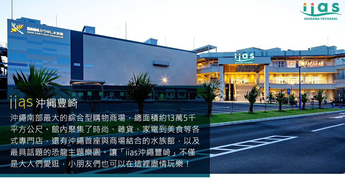 【IIAS 沖繩豐崎購物中心】沖繩南部最大的綜合型購物商場「IIAS 沖繩豐崎」於 2020 年 6 月 19 盛大開幕! 總面積 13 萬 5 千平方公尺,地上四層。館內不但有沖繩首座與商場結合的水族館『DMM Kariyushi 水族館』,還有許多初 次在沖繩展店的品牌;而最具話題的,可 能就是頂樓的恐龍主題樂園了!各種豐富的規劃,讓「iias 沖 繩豐崎」不僅是大人 們愛逛,小朋友們也可以在這裡盡情玩樂!您可別錯過這全新的體驗型商場。購物 只是佔其中一部份 。水族館、遊樂場、餐廳、海景、全新的美食廣場, 沖繩親子體 驗等等。再加上坐落 在漂亮的沙灘旁邊,和周邊方便的交通,形成一個沖繩獨有購 物結合遊憩的精華商場。