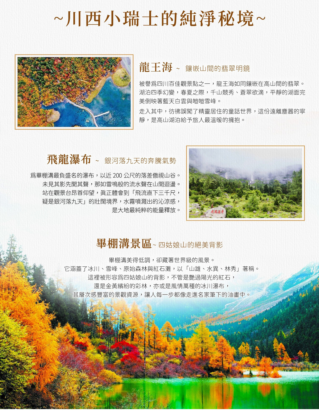 ※進入九寨溝景區後的所有景點皆為套票,如景區內任一景點因任何情況關閉無法參觀,景區是無法針對任何 單一景點作退費處理,以上說明敬請見諒!