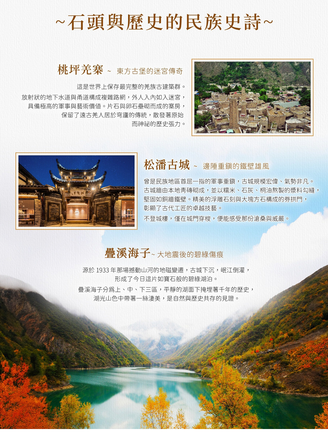 ※此地區屬於高海拔地區,在 2000 米至 3500 米之間,不宜劇烈運動,宜少飲酒,多食蔬菜、水果,以防高山 反應,年老體弱或平日有服藥者,請備好常用藥品。
