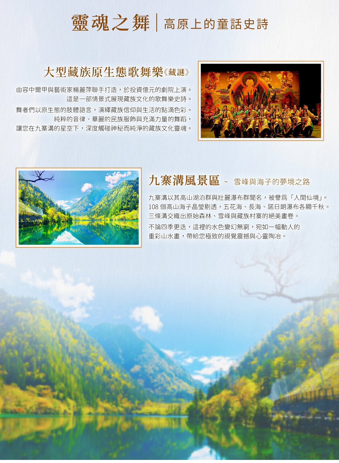 共分三條溝:日則溝、樹正溝、則查窪溝 3 條主溝。景觀分布在樹正、諾日朗、劍岩、長海、扎如、天海六大 景區。此外風景的精華是令人歎而觀止色彩斑爛晶瑩透明的 108 高山海子。九寨溝以高山湖泊群和瀑布群為其主要特點,集湖、瀑、灘、流、雪峰、森林及藏族風情為一體,因其獨有原始自然美,變幻無窮的四季景觀, 豐富的動植物資源被譽為「人間仙境」「童話世界」讓您走進九寨溝,將陶醉於最高的美的享受。