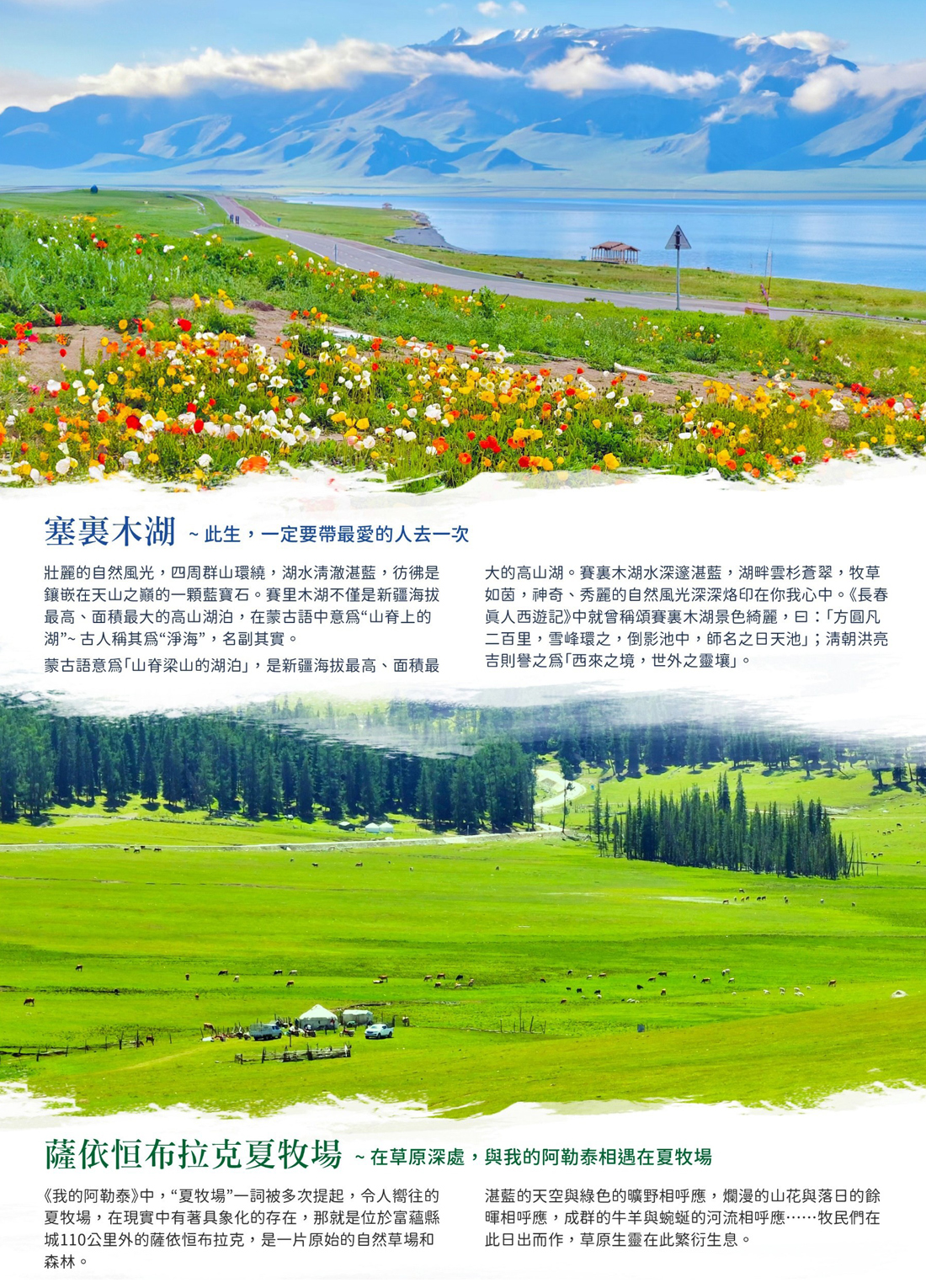 新疆素有攝影者的天堂、千里畫廊、特殊地質風貌和迷人的多民族風采,新疆的美,難以言喻。新疆很多種玩法,但多以南、北區格,北疆有巴音布魯克、那拉提的翠綠草原,大草原上牛羊成群,在喀納斯湖、賽里木湖有彩色繽紛的野花海,峽谷風光,造訪世界最低地土魯番-西遊記中的火焰山,在維吾爾農家採葡萄品甜瓜...新疆!人生必遊,讓我們就從北疆留下美好足跡。