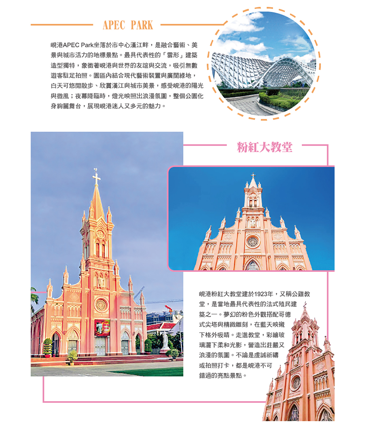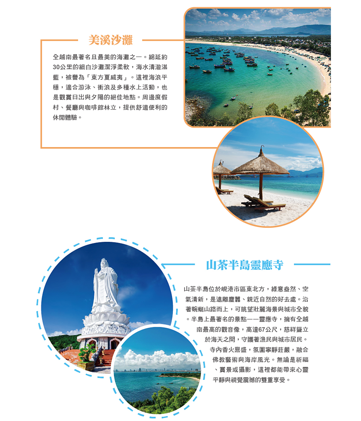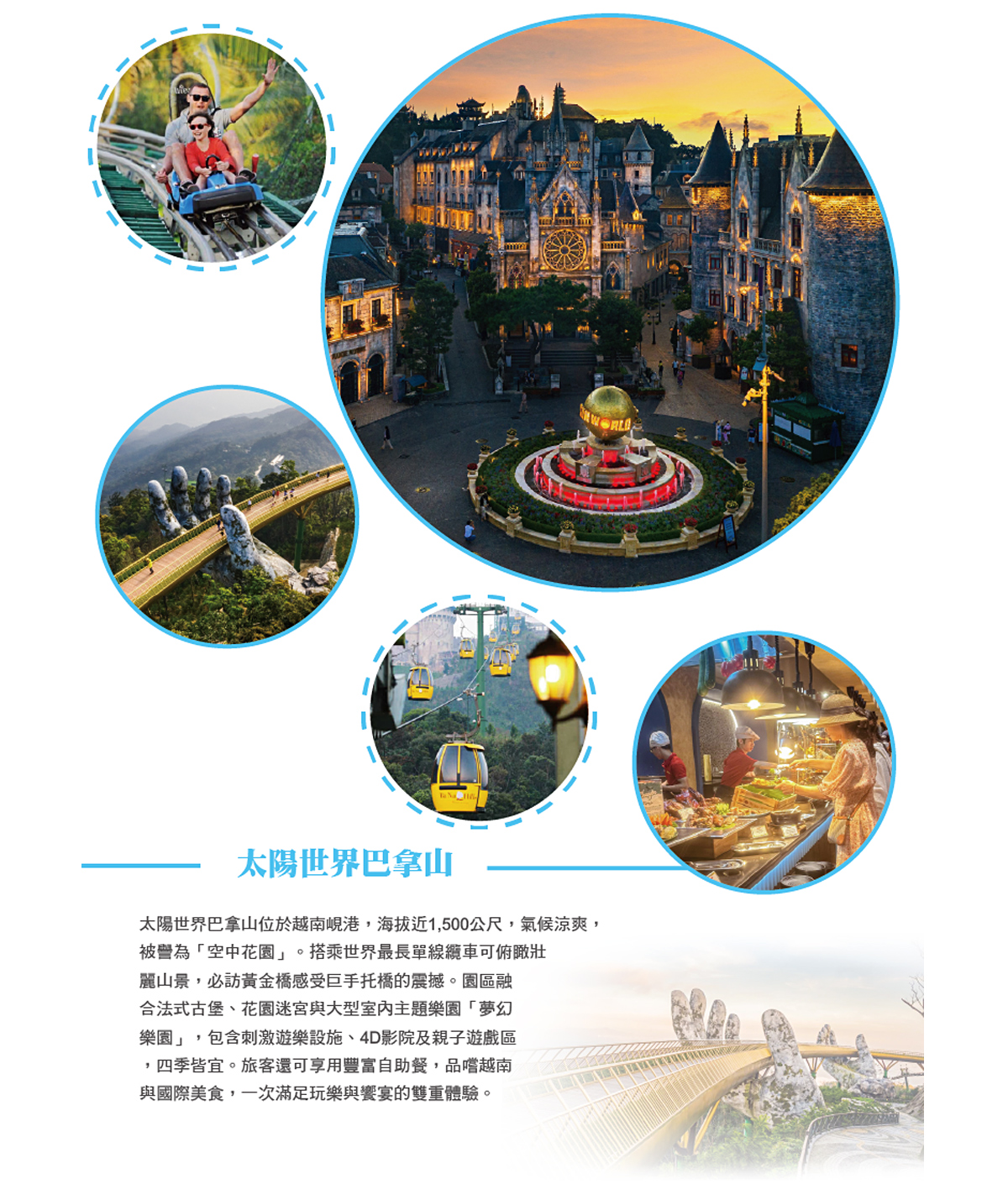 【法式巴拿山城】離峴港市約45公里處,地勢優美,素有法國春天山城之美譽【婆納山】。在此搭乘2009年被列為健力士記錄的全球最長及最高不停站纜車,纜車長16545呎,20分鐘直達海拔4239呎的山上。山城上滿山接是法式國巴洛克式建築群美輪美奐彷彿置身在香榭里大道。