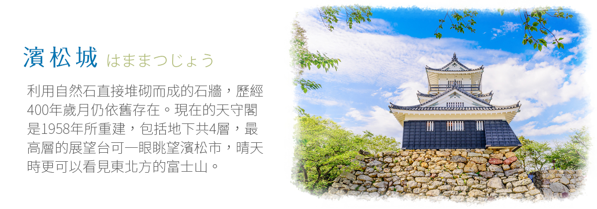【濱松城】是江戶時代(17世紀初~1867年)的第一代將軍德川家康在成為日本統治者前的17年間居住的城池。由于是在為統一天下而戰時期居住的城池,因此該城也叫出世城。16世紀所築的城池是濱松城的前身,之後經過多次擴建形成了濱松城。城池面積南北長約500米、東西寬約450米。現在的天守閣(位于城堡中心的主建築城樓)是1958年重建的,為3層4樓建築。最高層有海拔約50米的暸望臺,可以遠眺太平洋等的風景。